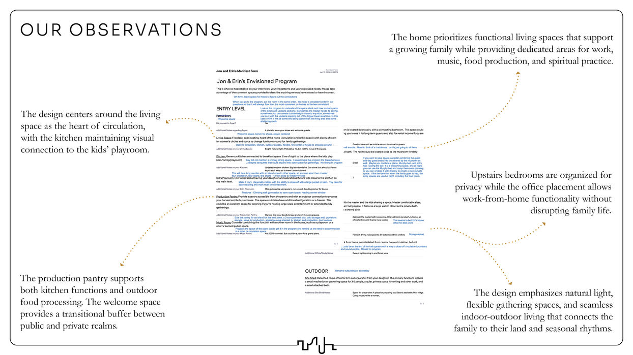 But how would we make it happen? We envisioned a Manifest they could carry with them to search the world for a perfect fit—whether an existing property they could adapt or land where they could build to suit their needs. They needed a house design that would translate their life patterns into an architectural framework they could use to compare potential housing discoveries.